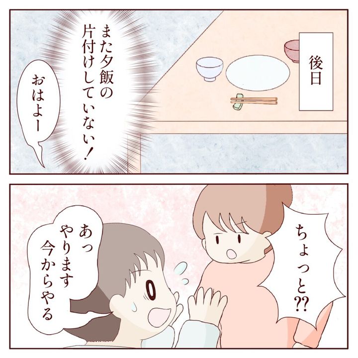 「また夕飯の片づけしていない!」と憤るチエミさんが、「おはよー」と起きてきたマサヒコさんに「ちょっと??」と詰め寄ると、「あっ、やります。今からやる」と慌てて答えました。