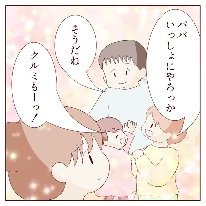 そして、「パパいっしょにやろっか」「クルミもーっ!」コノハくんとクルミちゃんがマサヒコさんにそう言うと、「そうだね」と答える姿を見て、チエミさんは一安心。