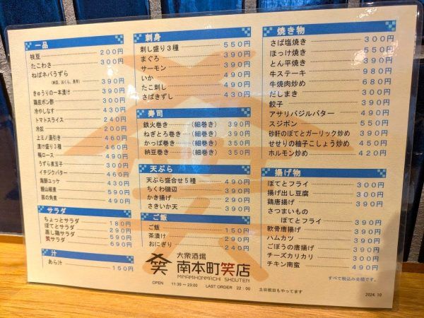 オフィスビル街の中に2024年7月にオープンした居酒屋さん。「南本町商店」ではなく、「南本町笑店」というのがいいですね~。楽しそうです。