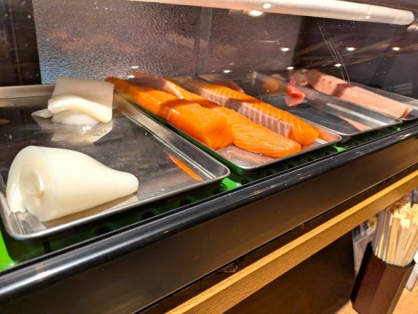 カウンターを見上げれば、ショーケースに寿司ネタがド~ンと!おいしそうなサーモンです。