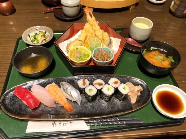 にぎり4種類と巻き物、天ぷら盛り合わせと小鉢に、茶碗蒸しとデザートも付くので、こちらもなかなかお得ですよね。