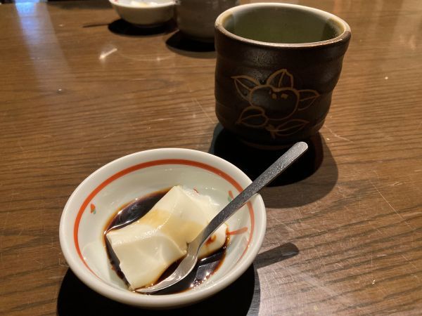 デザートの杏仁豆腐の黒蜜ソースと熱いお茶でお腹いっぱいです~。