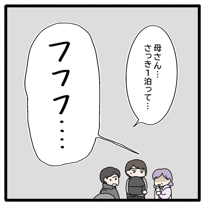 ランチのために何時間も車を走らせてようやくたどり着いた山奥のホテル。確かに素敵ですが、生後6ヶ月のあかりは、まだ遠出をしたことが無かったので、せめて事前に伝えて欲しかった。しかも受付をした義母が「1泊」と言っていました。カードキーを受け取って戻ってきた義母に、動揺している夫のヨシオが「母さん・・・さっき1泊って・・・」と聞くと義母は「フフフ・・・」と満足そうに笑い始めました。