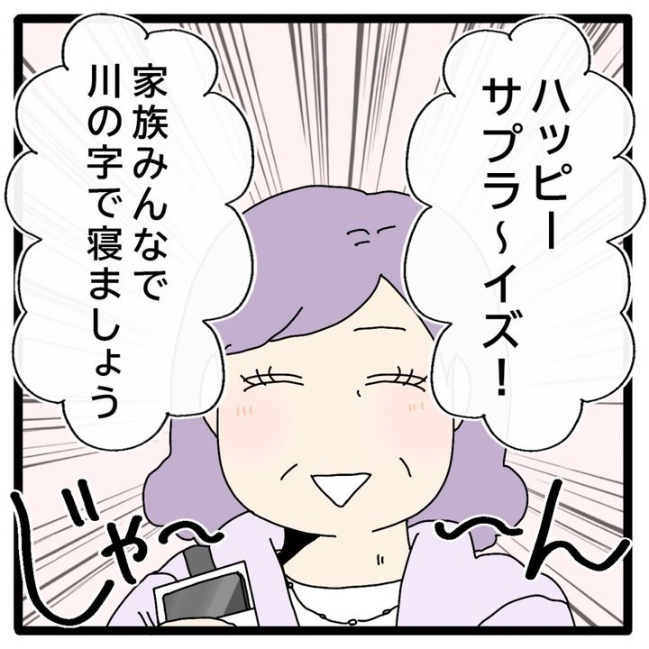 すると「ハッピーサプラ~イズ!家族みんなで川の字で寝ましょう」と満面の笑みの義母。日帰りで義実家を訪問するだけの予定が、前日の義母の急な予定変更でこんなことに。
