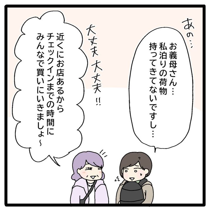 なんとか断れないかと私は「あの、お義母さん・・・私泊りの荷物持ってきてないですし・・・」と言いますが義母は最初からそう言われることを分かっていたようで「大丈夫大丈夫!近くにお店あるからチェックインまでの時間にみんなで買いに行きましょ~」と言われてしまいました。