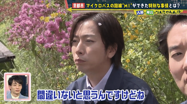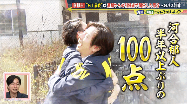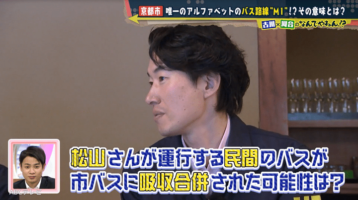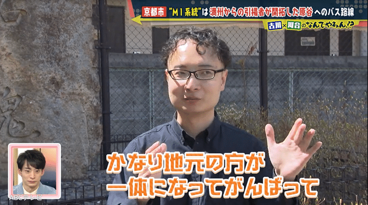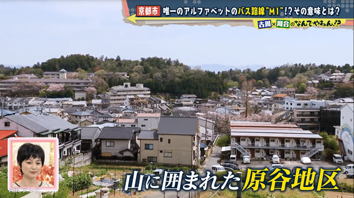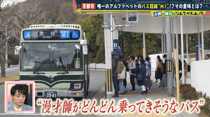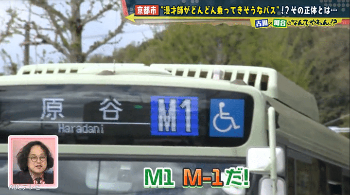漫才師がどんどん乗ってきそうなバス”は、京都市バス唯一のアルファベットを冠した路線・M1(エムイチ)系統のことだった! 「エムいち、「M-1」だ!!」と気づいたタレントの河合郁人とABCテレビの古川昌希アナウンサーは、M1が何を意味するか調べるべく、立命館大学前からバスと同じルートをたどって、終点の原谷へ向かった。