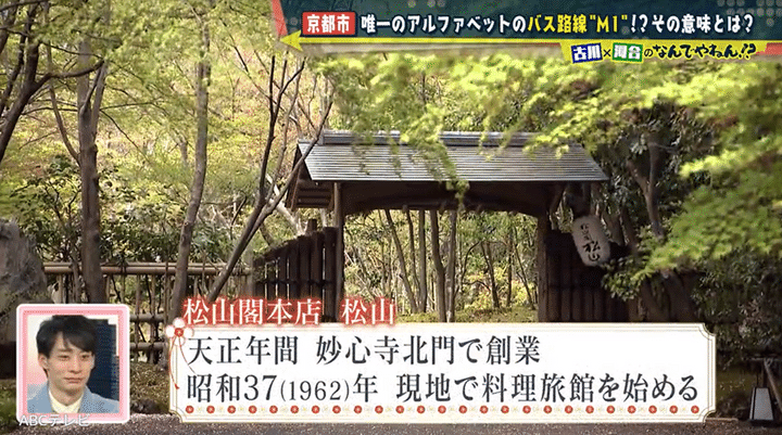 原谷は、周囲を山に囲まれたのどかな集落だ。さっそくMがつくものを探した河合と古川アナは、昭和37年創業の京料理店・松山閣 松山にたどり着いた。そこで彼らは、「原谷行きのバスは、かつて松山さんが運行していた民間のバスが始まりで、松山のMがつけられたのでは?」という仮説を立てた。