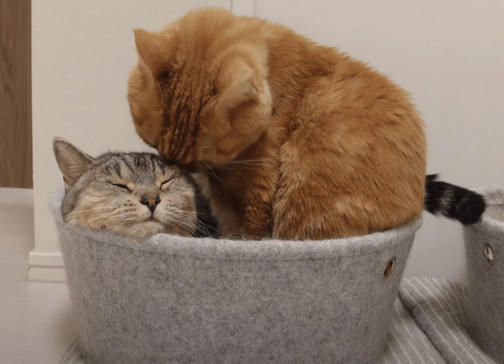 自分用のベッドもあるけれど、姉猫のベッドに潜り込む甘えん坊な猫さん