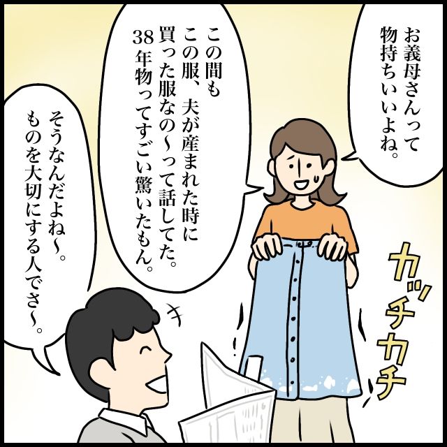 「お義母さんって物持ちいいよね」繊維が潰れてカッチカチになったタオルを持ちながら、「この間も、『この服、ジュンペイが産まれた時に買った服なの~』って話してた。38年物!?ってすごい驚いたもん」夫にそう言うと、「そうなんだよね~。ものを大切にする人でさ~」と笑顔で言われた。