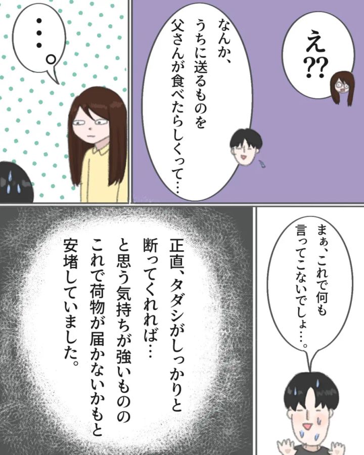 「なんか、うちに送るものを父さんが食べたらしくって・・・」と困惑気味に話す夫の顔を、無言のまま意味深な顔をして見つめてしまった私は、正直タダシがしっかりと断ってくれていればと思う気持ちが強いものの、これで常温の料理が届くことは無くなると安堵していました。夫も、さすがにこれで義母も何も言えなくなると思っていたようです。