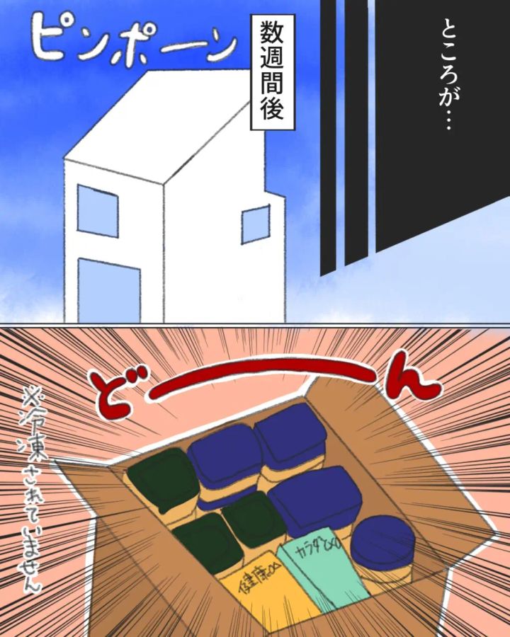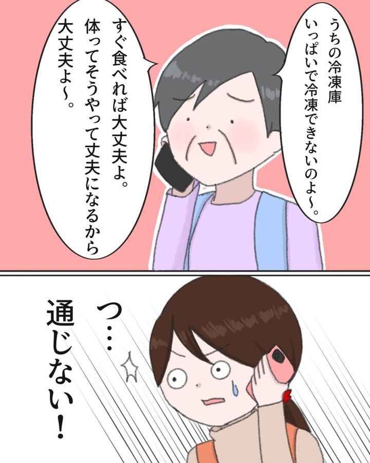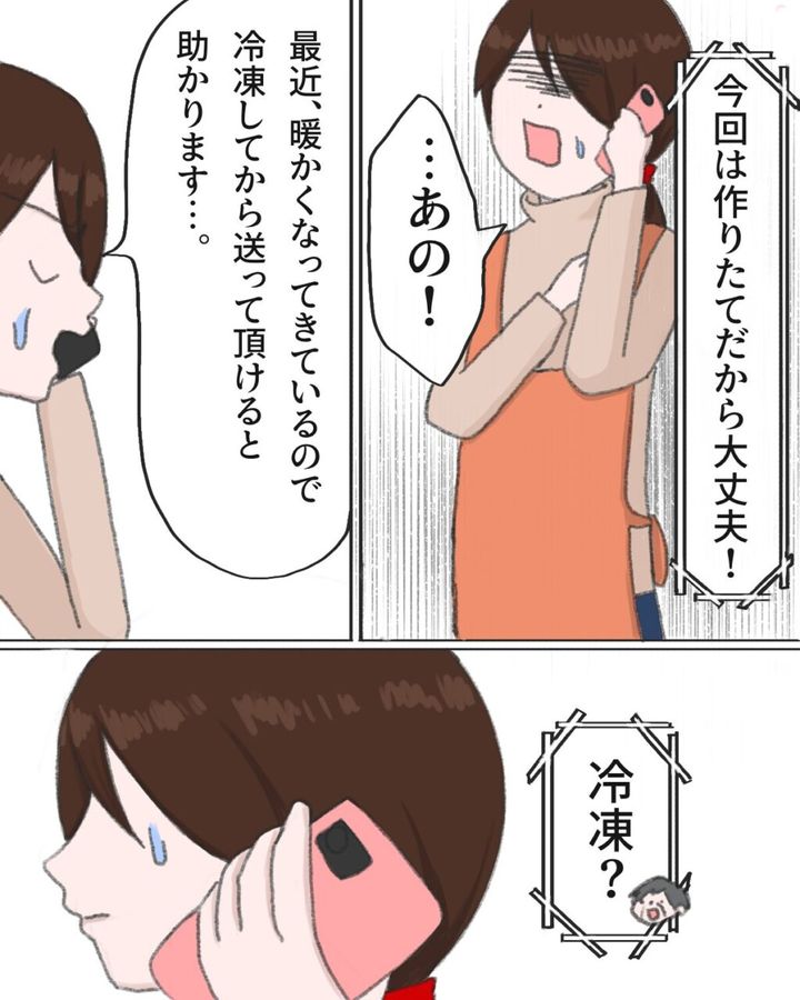 自信満々に「今回は作り立てだから大丈夫!」と言い切るので、さすがに私からも伝えようと思いました。「最近暖かくなってきているので、冷凍してから送っていただけると助かります。」さすがにわかるでしょう?常温で食べ物を送ったらどうなるかくらい・・・。ところが義母は「冷凍?」と、驚いたような声をあげました。いや驚いたのは私の方です。