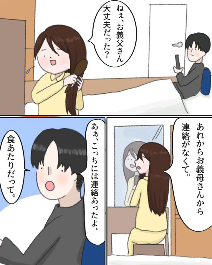 義父が体調不良で運ばれたと聞いてから、義母から連絡がないのが心配で夫に聞いてみたところ、義父は食あたりだったことがわかりました。義母は夫に連絡をしていたのです。