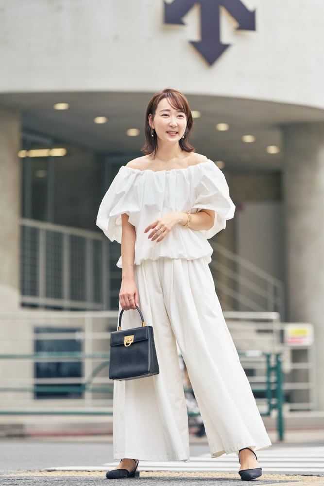 ストラップ部分が2WAY仕様で着回し可能なルタロンのチュールミュール。長時間歩いてもどこも痛くならず、あまりの歩きやすさに2足目の購入を検討しているほどお気に入りです。オフショルダーブラウスにワイドパンツというボリューミーな合わせも白でまとめて軽やかに。小物はブラックに統一して引き締めました。チュールの透け感がコーデに今っぽさを添えてくれます。