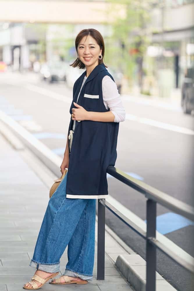 アダムエロぺのビーズサンダルは“日焼けした足に似合う靴”というテーマで探したもの。キラキラ光るビーズの輝きが、40代のいろいろ気になる足元のアラ隠しに一役買ってくれます。アネフォーになって着こなしが難しくなってきたデニムには、縦のラインを強調するジレを合わせてオバ見え回避。シアートップスで抜け感を加えてスッキリ見えを狙いました。