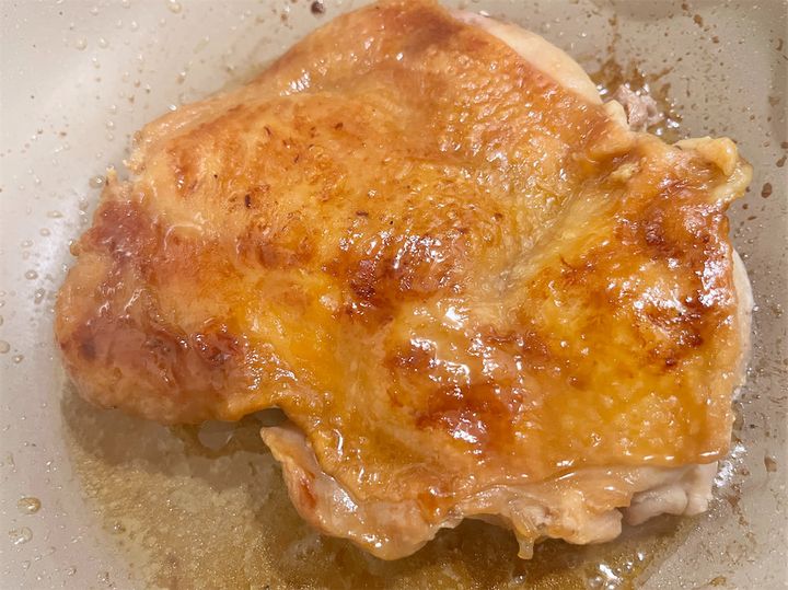 しょうゆだけで、まるで照り焼きのような美しいツヤが出ています。これまで何度も鶏肉を焼いてきましたが、一番おいしそうに焼けたかも♡