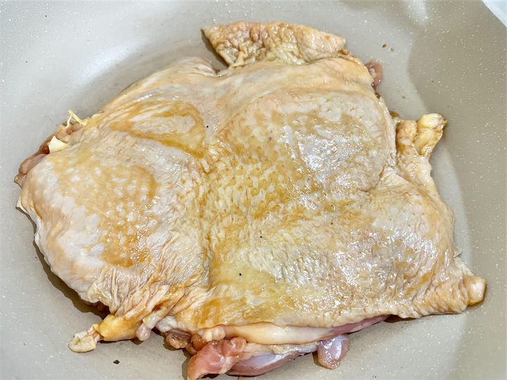 4. フライパンに少量の油(分量外)を引き、3の鶏肉の肉側を下にして入れる。ごく弱火で1分ほど焼く。