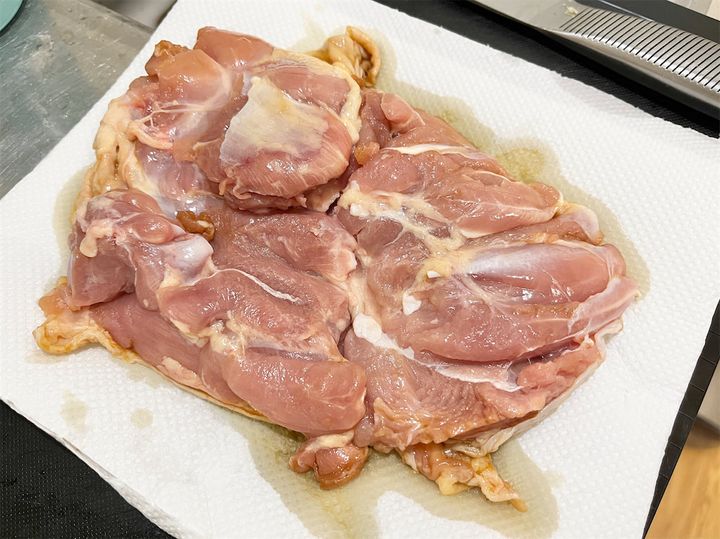 3. 2の鶏肉を皮面を下にしてキッチンペーパーの上に置き、余分なしょうゆを取る。肉に軽く塩(分量外)をふる。