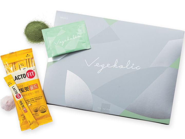 有機大麦若葉、ケール、すいおうに3種食物繊維、2種乳酸菌をプラス。不足しがちな栄養素を補給しつつ腸内環境を整える。ベジホリック 32袋入り ¥4,290(Mukii)