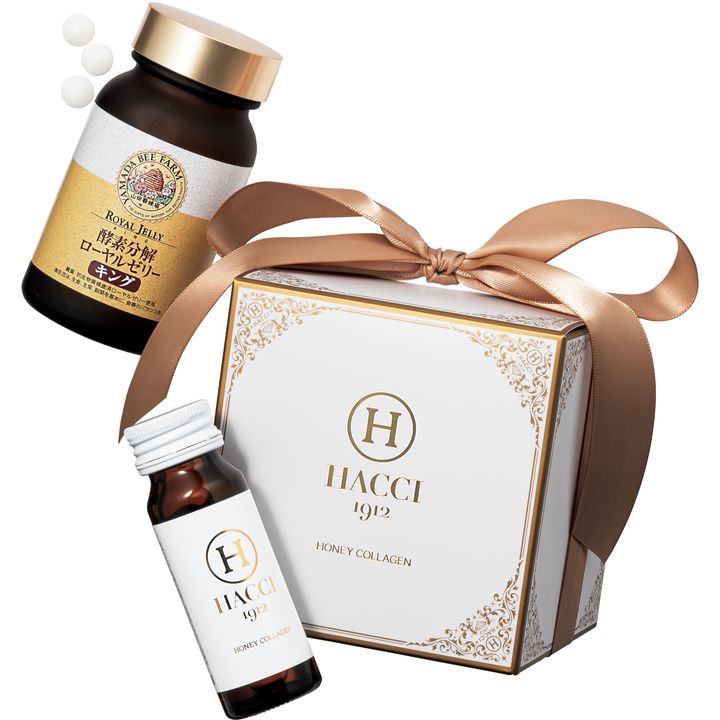 ローヤルゼリー&はちみつにフィッシュコラーゲンなど配合。トータルで肌状態を底上げ。ハニーコラーゲン 9本 ¥5,400(HACCI)