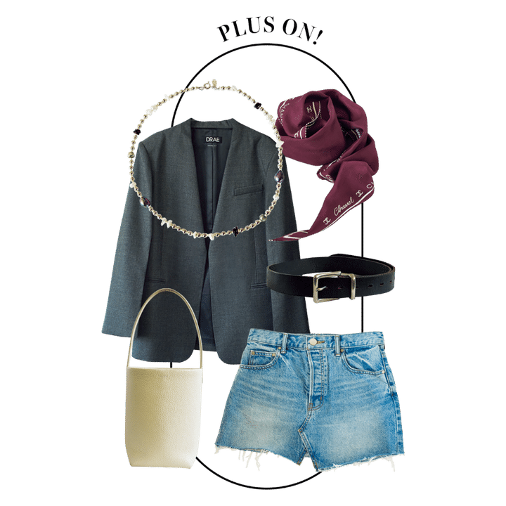 シャネルのスカーフ、ポーリーンステュデオで購入したネックレス、ドラエのジャケット、ヴィンテージのベルト、ブラックバイマウジーのデニムミニスカート※デニムパンツとセット、ザ・ロウのバッグは本人私物