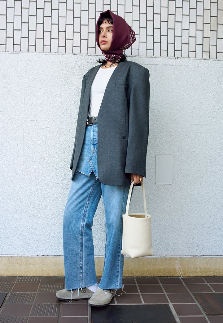 STYLING▶︎デニムのレイヤードやスカーフ使いでトレンドを意識