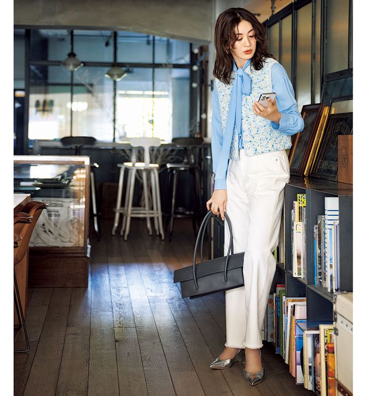 甘いボウタイシャツは、ブルーで知的に洗練。幅広い世代が一緒に働くオフィスでは白×ブルーで品よく信頼感を意識。同系色のツイードベストを重ねて甘ボリュームの微調整を。