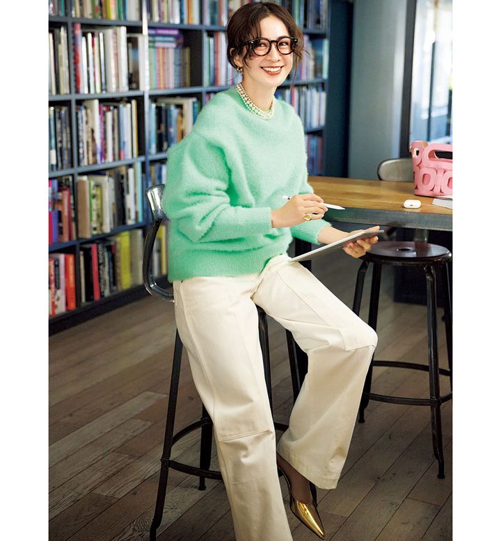 パンツ¥39,600(ebure/LITTLE LEAGUE INC.)ニット¥36,300(ロエフ/ユナイテッドアローズ 渋谷スクランブルスクエア店)バッグ¥68,200〈ペリーコ〉靴¥33,000〈ペリーコ サニー〉(ともにアマン)メガネ¥44,000(アイヴァン/アイヴァン 東京ギャラリー)ピアス¥20,900ブレスレット¥17,600(ともにローラ ロンバルディ/八木通商)ネックレス[一連]¥8,640ネックレス[二連]¥7,150(ともにアビステ)リング¥34,100(リューク)