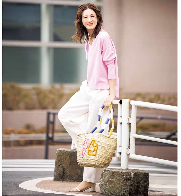 パンツ¥36,300(ダブルスタンダードクロージング/フィルム)カーディガン¥24,200(ル フィル/LE PHIL NEWoMan新宿店)タンクトップ¥8,800(ハイク/ボウルズ)バッグ¥31,900(キロメートル パリ/ロンハーマン)靴¥137,500(ジャンヴィト ロッシ/ユナイテッドアローズ 麻布台ヒルズ ウィメンズストア)ピアス¥19,800(ローラ ロンバルディ/八木通商)ネックレス¥27,500(マリハ)