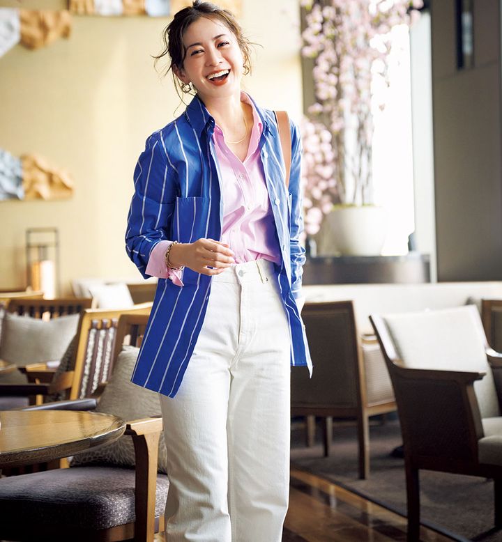 白にカラーを重ねて、好感度を引き寄せ! 春を感じるピンクシャツにジャケット見えするブルーのストライプシャツを羽織った最旬甘ニッシュが新鮮。
