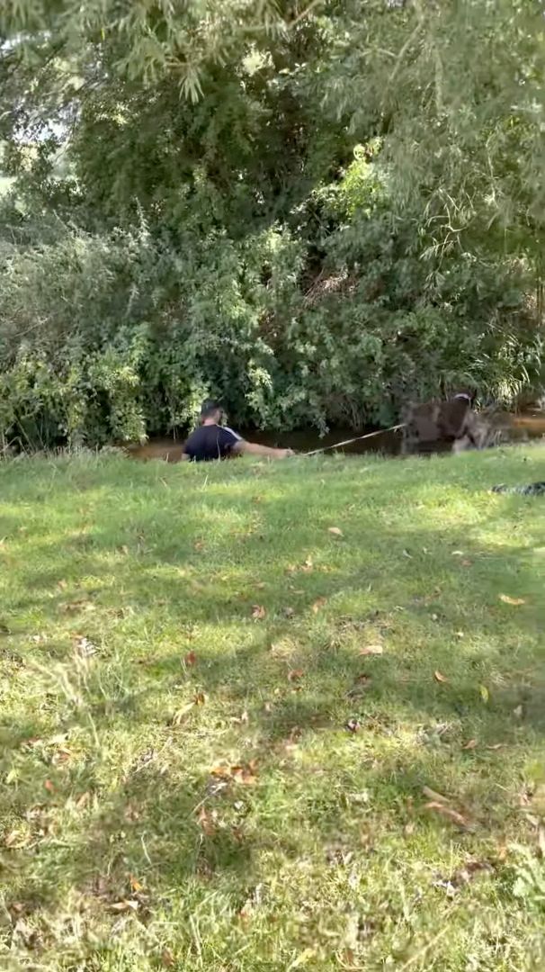 どうやら、愛犬が駆け出したたので、リードを握っていたこの男性は引っ張られて川の中に落ちてしまったようです。 確かに、映像を確認してみるとピンと張ったリードを男性が手にしているのが確認できます。
