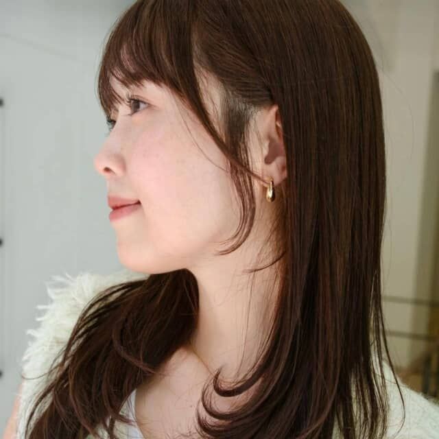ストレートベースのヘアスタイルは内巻きだけだと少し保守的な印象に。今っぽさを出すなら、毛先に軽い外ハネをミックスしましょう。特に顔周りの髪は内側に入れすぎず、ほんのり浮かせるイメージで。前髪は透け感を意識して、眉毛が程よく見える仕上がりにして、耳かけスタイルも取り入れると、こなれ感がアップして今っぽい抜け感が手に入ります。