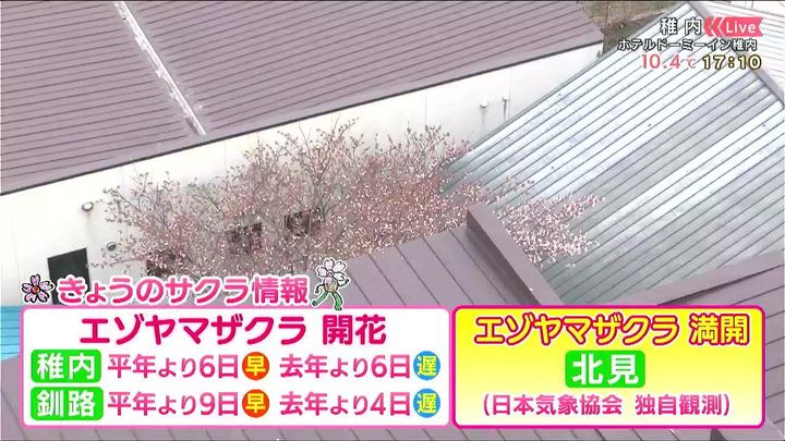 きょう7日(水)、稚内と釧路の気象台でサクラ開花の発表がありました。ともに平年より早い観測です。また日本気象協会の独自観測ですが、北見では満開になりました。
