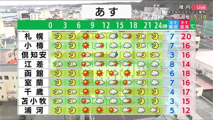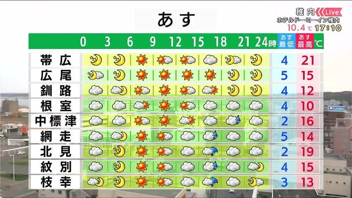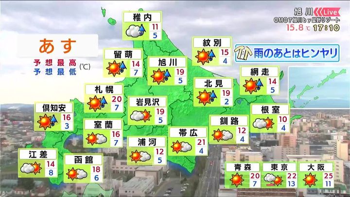 晴れ間が出ますが、道東の山沿いやオホーツク海側で午後はにわか雨があるでしょう。朝は冷えますが、日中は帯広や北見で20度前後まで気温が上がります。