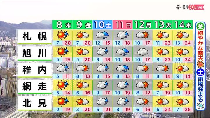 金曜はにわか雨もなく、穏やかに晴れるでしょう。土曜は雨が降り、札幌周辺で雨や風が強まります。来週は晴れて、札幌の水曜の最高気温24度です。夏服の準備も進めておきたいですね。