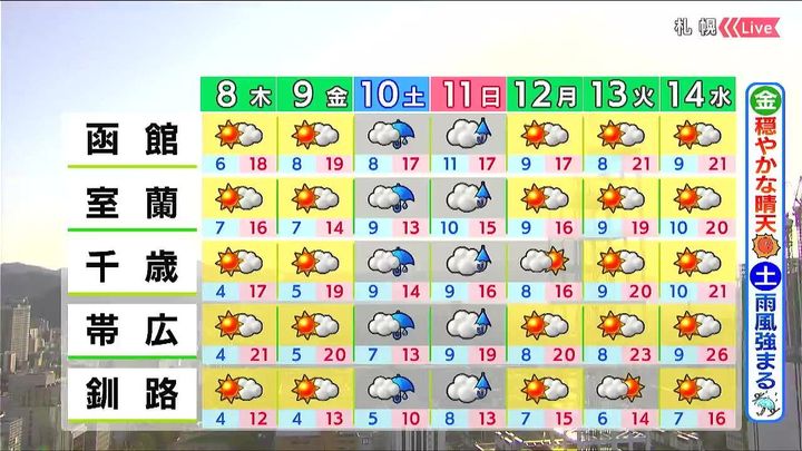 金曜は晴れて函館や内陸で20度くらいまで気温が上がります。土曜は雨や風が強まりヒンヤリします。来週は晴れて、水曜の帯広の最高気温は26度です。