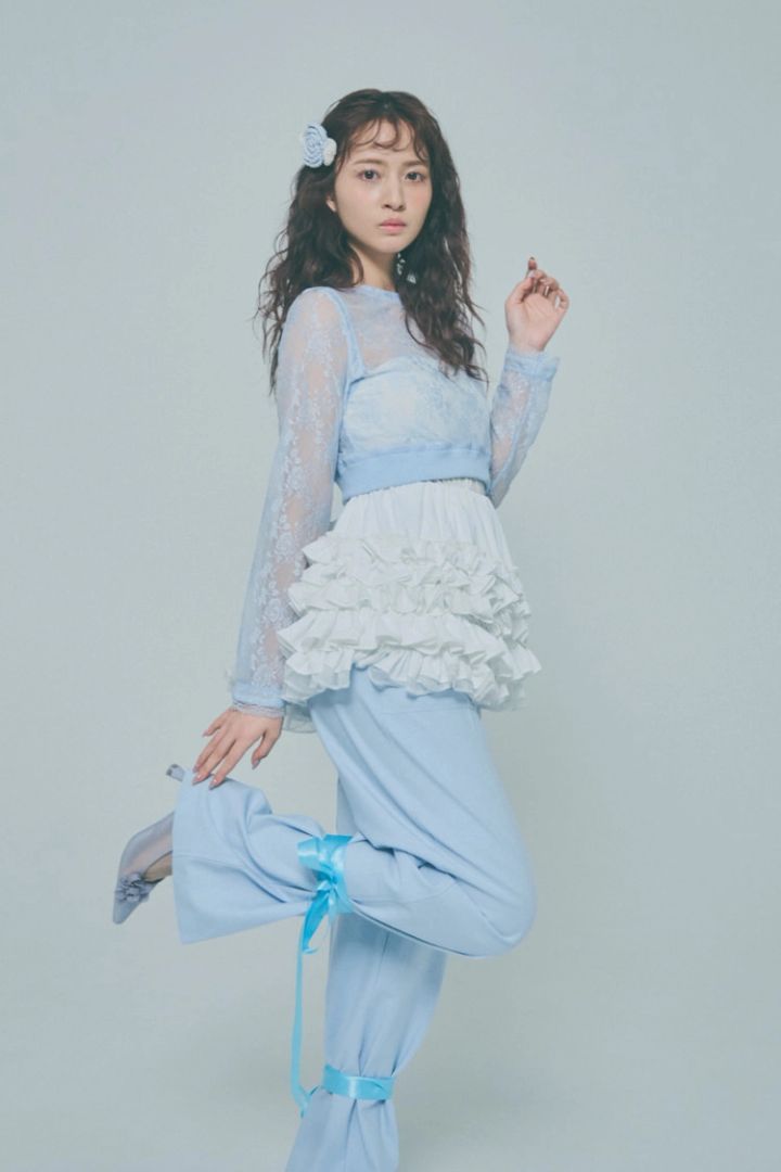 ブルーレーストップス 7,980円/Treat Ürself ブルーパンツ 7,990円/ZARA(ザラ)白フリルミニスカート 15,950円/J1U by LA BELLE ETUDE(アンティローザ)ヘアクリップ 3,300円/kaorinomori(OVERRIDE ルミネエスト新宿)パンプス 9,900円/RANDA パンツに巻いたリボン/スタイリスト私物