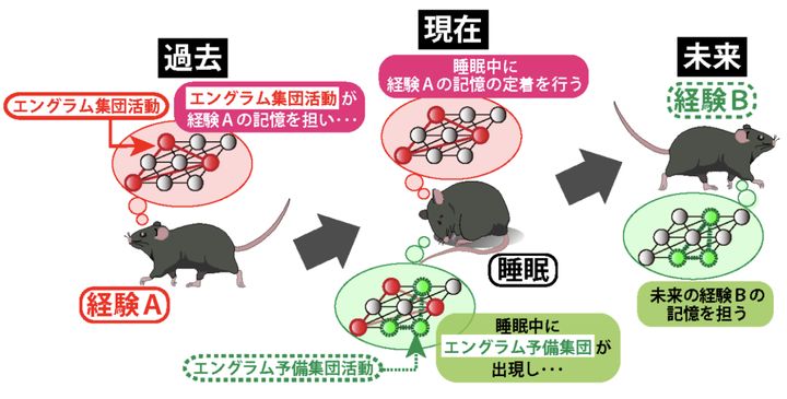マウスの脳内で過去・現在・未来の記憶がどのように処理されるかを示した概念図です。左の枠「過去」では、赤い円で示されたエングラム細胞集団(記憶を担う神経細胞の集まり)が経験Aの記憶を符号化しています。中央「現在」(睡眠中)では、過去の経験Aの記憶を担う赤いエングラム細胞が再び活動して記憶の定着が行われると同時に、緑色の「エングラム予備細胞集団」が出現しています。右の枠「未来」では、この睡眠中に準備された緑の予備細胞集団が、次の日の新たな経験Bの記憶を担う様子を示しています。つまり睡眠中の脳では、過去の記憶を整理すると同時に未来の記憶の下準備も進められているのです。/Credit:脳が未来の記憶に備える重要なプロセスを発見— 睡眠は単なる休息ではない —