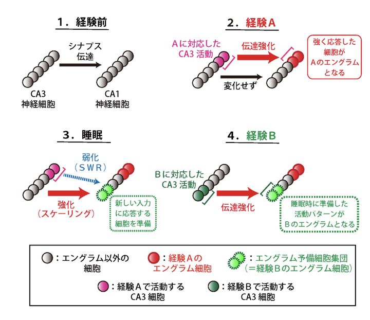 図は、海馬のCA3領域からCA1領域に情報が伝わる神経回路モデルを使って、睡眠中のシナプス調整がどのように未来の記憶担当細胞(エングラム予備集団)を生み出すかを示したものです。図の左側にはCA3神経細胞からCA1神経細胞へ向かう矢印が並び、矢印の太さがシナプスの強さ(情報伝達の効率)を表しています。まず経験Aの段階では、CA3から送られる特定の入力パターンに対してCA1内の一部の細胞が大きく反応し、そのシナプスが太く強化されます。これが「エングラム細胞」の形成過程です。次に睡眠中には、シャープウェーブ・リップル(SWR)波という脳波に伴い、エングラム細胞のシナプスは保護されつつも不要な結合は弱まる一方で、全体のシナプス結合のバランスを保つシナプススケーリングが働きます。その結果、もともと目立たなかった別の細胞群が次の入力パターンに敏感に反応するようになり、これが「エングラム予備細胞集団」として浮上します。最後に経験Bが到来すると、この予備細胞集団のシナプス結合がさらに強化され、正式に経験Bのエングラム細胞へと昇格します。図は、こうした一連のシナプス動態が「過去の記憶の整理」と「未来の記憶の仕込み」をつなぐ仕組みを示しています。/Credit:脳が未来の記憶に備える重要なプロセスを発見— 睡眠は単なる休息ではない —