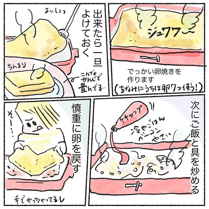 こんにちは!4児の母で漫画家兼公認会計士のAyumiです。子どもも大人も大好きオムライス。本来はケチャップライスを作ってから1つ1つ卵で包むと思いますが、わが家の作り方は少々大胆でして。難しい技は必要なし!なおかつ、簡単でコスパも良い!ホットプレートを使って、オムもライスも家族分一気に作っちゃいます。知って得する“お助けメニュー“をご覧あれ♪
