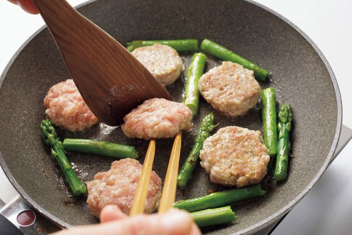 (2)フライパンに(1)の肉だねを並べ、あいたところにアスパラも加えて中火にかける。そのまま4~5分焼き、返して2~3分焼く。しょうゆ小さじ1を全体にふりかけ、さっとからめる。