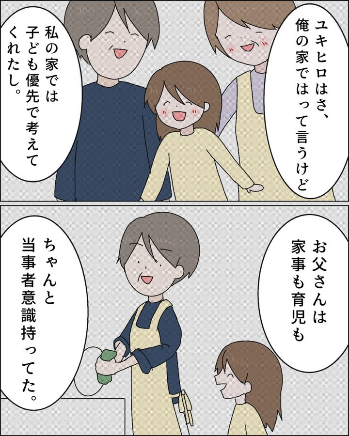 私はユキヒロが父親が偉くて優先だったと繰り返す「俺の家」の主張にも反論しました。「私の家では子ども優先で考えてくれた。お父さんは家事も育児もちゃんと当事者意識持ってた。」