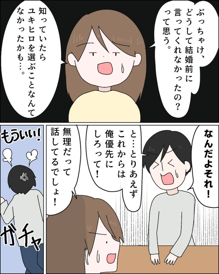 ユキヒロと話しているうちに、なんでこんな人選んだんだろ?という気さえしてきた私。「ぶっちゃけ、どうして結婚前に言ってくれなかったの?って思う。知っていたらユキヒロを選ぶことなんてなかったかも。」・・・言ってしまった。つい、本音を。ユキヒロは「何だよそれ!」と怒り出して「と、とりあえずこれからは俺優先にしろって!」とまだ言っていました。「無理だって話してるでしょ!」と私もつい大きい声を出してしまいました。ユキヒロは怒りながら「もういい!」と部屋を出ていきました。