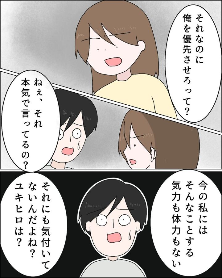 そんなユキヒロを、まだ優先しろって、本気で言ってるの?2人ワンオペ育児中の私には、義母が義父を優先してなんでもお世話するようなこと、気力も体力もなくて無理。「それにも気づいてないんだよね?ユキヒロは。」私が言うと、ユキヒロは何も言い返せずに黙っていました。