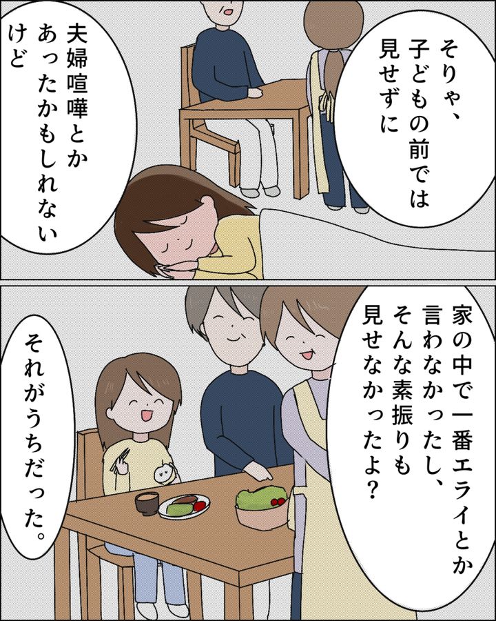 私の両親はいつも笑顔で私を見てくれていました。もしかしたら私の前では見せずに夫婦喧嘩があったかもしれないけれど、家の中で誰が一番偉いとか言わなかったし、そんな素振りも見せませんでした。