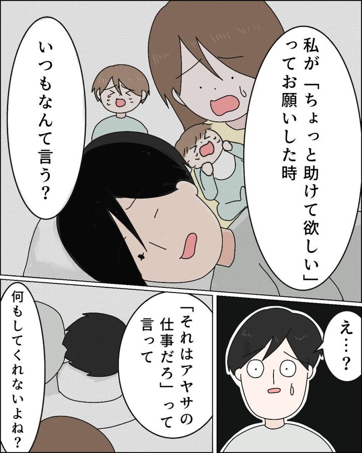 2歳と0歳の息子たち優先の生活が不公平だから自分優先にして欲しいと言い出した夫に「無理。むしろユキヒロにも子どもたちを優先して欲しい」と言った私。平日は元気で頻繁に酔っぱらって帰宅するのに休日になると決まって体調が悪くなりいつまでも起きてこなくても、仕事の付き合いもあると思い何も言ってきませんでした。そんなユキヒロは私がいつも子どもたちのお世話で寝不足だし全然休めていないことなどお構いなし。私が「ちょっと助けて欲しい」とお願いしても、いつもゴロゴロしたまま「それはアヤサの仕事だろ」と言って何もしてくれません。