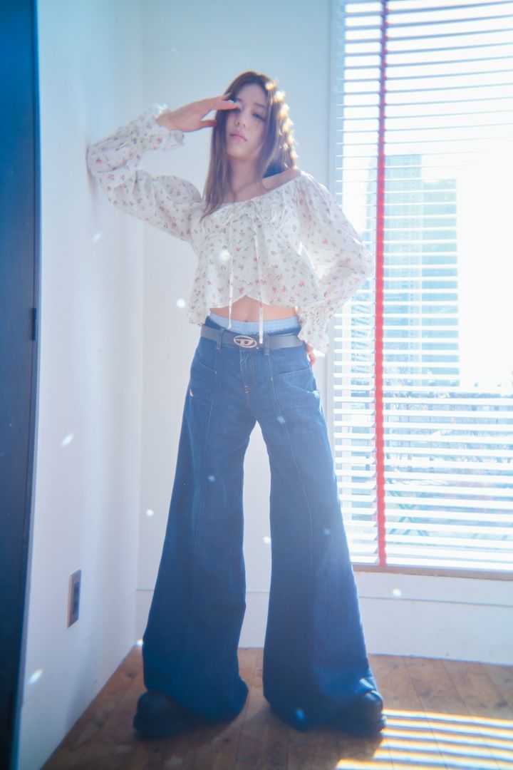 審良ふたば。ar5月号より デニム¥39,600、ベルト¥35,200/ディーゼル(ディーゼル ジャパン) ブラウス¥15,400/ガールズソサエティ ショートパンツ¥9,900/マウジー(バロックジャパンリミテッド) サンダル¥25,300/アグ® (デッカーズジャパン)