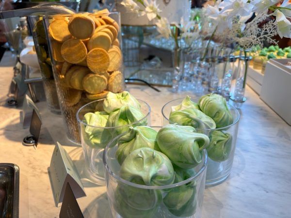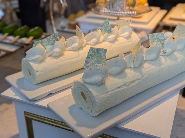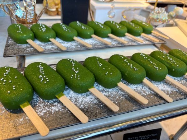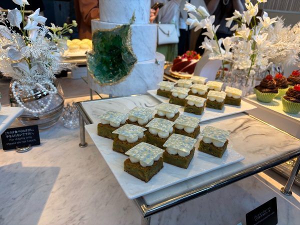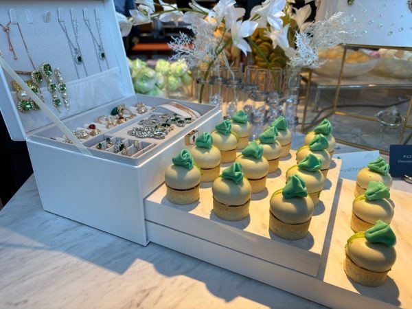 5月の誕生石である「エメラルド」の華やかなジュエリーをイメージするグリーンカラーで、ミント、グリーンアップル、メロン、抹茶などを使用した約20種類のゴージャスなスイーツと、セイボリー(軽食)が並んでいます。