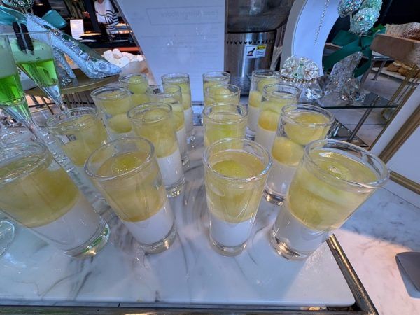 2層に分かれていて、上の透明の部分はフレッシュなメロンまたはメロンの果実とメロンゼリー、下の部分はジンジャーの風味が口の中に広がるパンナコッタです。