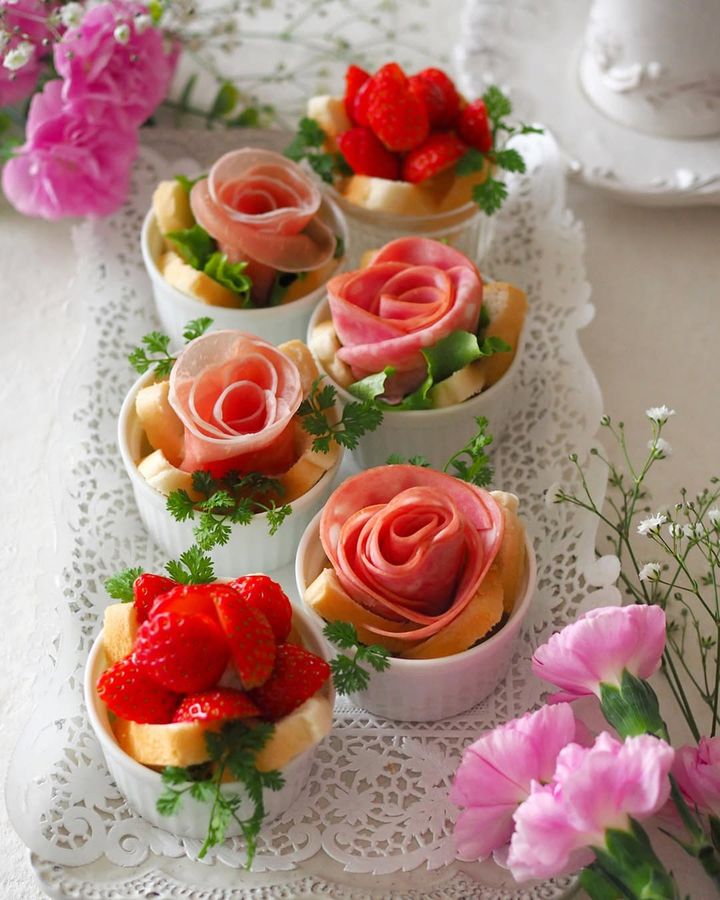 ココットの中にはスライスした食パンを入れてから、クリームチーズや生クリームをたっぷりと。レタスやハーブを葉っぱに見立てたら、お花をイメージしてクルクルと丸めた生ハムやビアソーセージ、苺を飾れば出来上がり。
