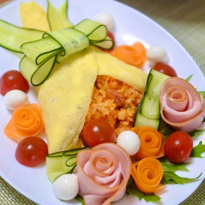 にんじんや生ハムで作ったお花ときゅうりのリボンを飾ってかわいらしく仕上げています。きゅうりのリボンは作るのが難しいようであれば、ケチャップでリボンを描くだけでも!